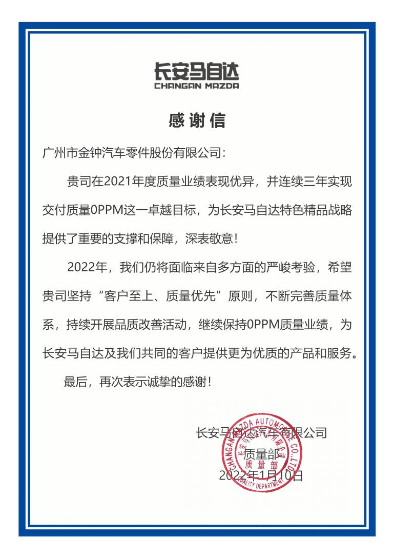 “客戶至上、質(zhì)量優(yōu)先”一直是金鐘汽車零件的原則,對于金鐘的客戶,我們一直奉行實現(xiàn)交付質(zhì)量OPPM這一目標(biāo),本次得到長安馬自達(dá)的認(rèn)可,更加增強(qiáng)了我們的信心。