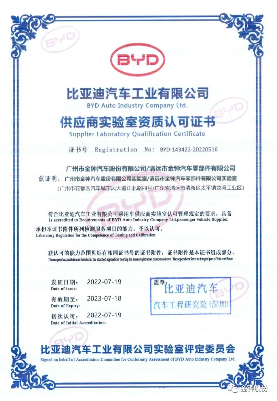 2022年7月19日,我司收到比亞迪汽車工業(yè)有限公司實驗室評定委員會頒發(fā)的供應商實驗室資質(zhì)認可證書,包括廣州市金鐘汽車股份有限公司實驗室和清遠市金鐘汽車零部件有限公司實驗室,均符合比亞迪汽車工業(yè)有限公司乘用車供應商實驗室認可管理規(guī)定的要求,具備承擔證書附件所列檢測服務項目(鋼輪裝飾罩、鋁合金車輪插件等)的能力。