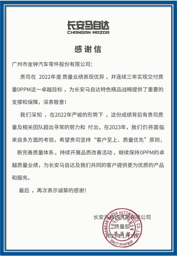 在過(guò)去的2022年,我司質(zhì)量及業(yè)績(jī)獲得長(zhǎng)安馬自達(dá)認(rèn)可,連續(xù)三年實(shí)現(xiàn)交付質(zhì)量0 PPM這一卓越目標(biāo),為長(zhǎng)安馬自達(dá)特色精品戰(zhàn)略提供了重要的支撐和保障。接下來(lái),我司會(huì)繼續(xù)把好質(zhì)量關(guān),持續(xù)開展品質(zhì)改善活動(dòng),繼續(xù)保持0 PPM質(zhì)量業(yè)績(jī),交出讓客戶滿意、讓市場(chǎng)滿意的答卷。